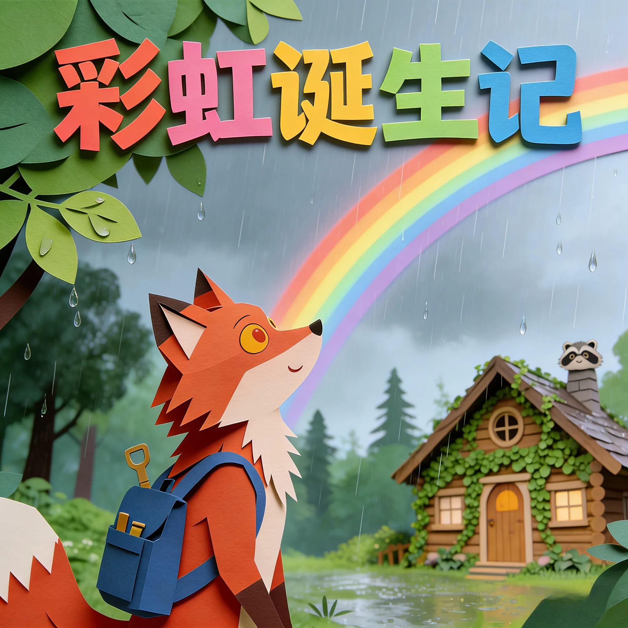 这个问题对福克斯来说有点难。他决定去请教森林里最聪明的浣熊爷爷。浣熊爷爷住在一棵老橡树下的木屋里,他什么都知道。福克斯收拾好背包,“嗒嗒嗒”地跑向森林深处。阳光透过树叶,洒下斑斑点点的光影,鸟儿在枝头歌唱。不一会儿,他就看到了那扇熟悉的、挂着风铃的木门。福克斯“咚咚咚”地敲了敲门:“浣熊爷爷,您在吗?我有一个关于彩虹的问题!”